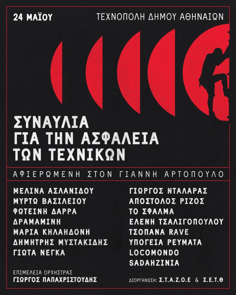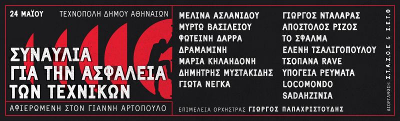 Με αφορμή την Παγκόσμια Ημέρα για την Υγεία και Ασφάλεια στην Εργασία, ημέρα αφιερωμένη στην εξάλειψη των εργατικών ατυχημάτων και των επαγγελματικών ασθενειών, σας καλούμε στην συναυλία που διοργανώνεται στις 24 Μαΐου στην Τεχνόπολη του Δήμου Αθηναίων. Με αφορμή την ημέρα αυτή τα Σωματεία και οι Ομοσπονδίες που εκδίδουμε αυτή την ανακοίνωση στηρίζουμε την συναυλία αφιερωμένη στον Γιάννη Αρτόπουλο.